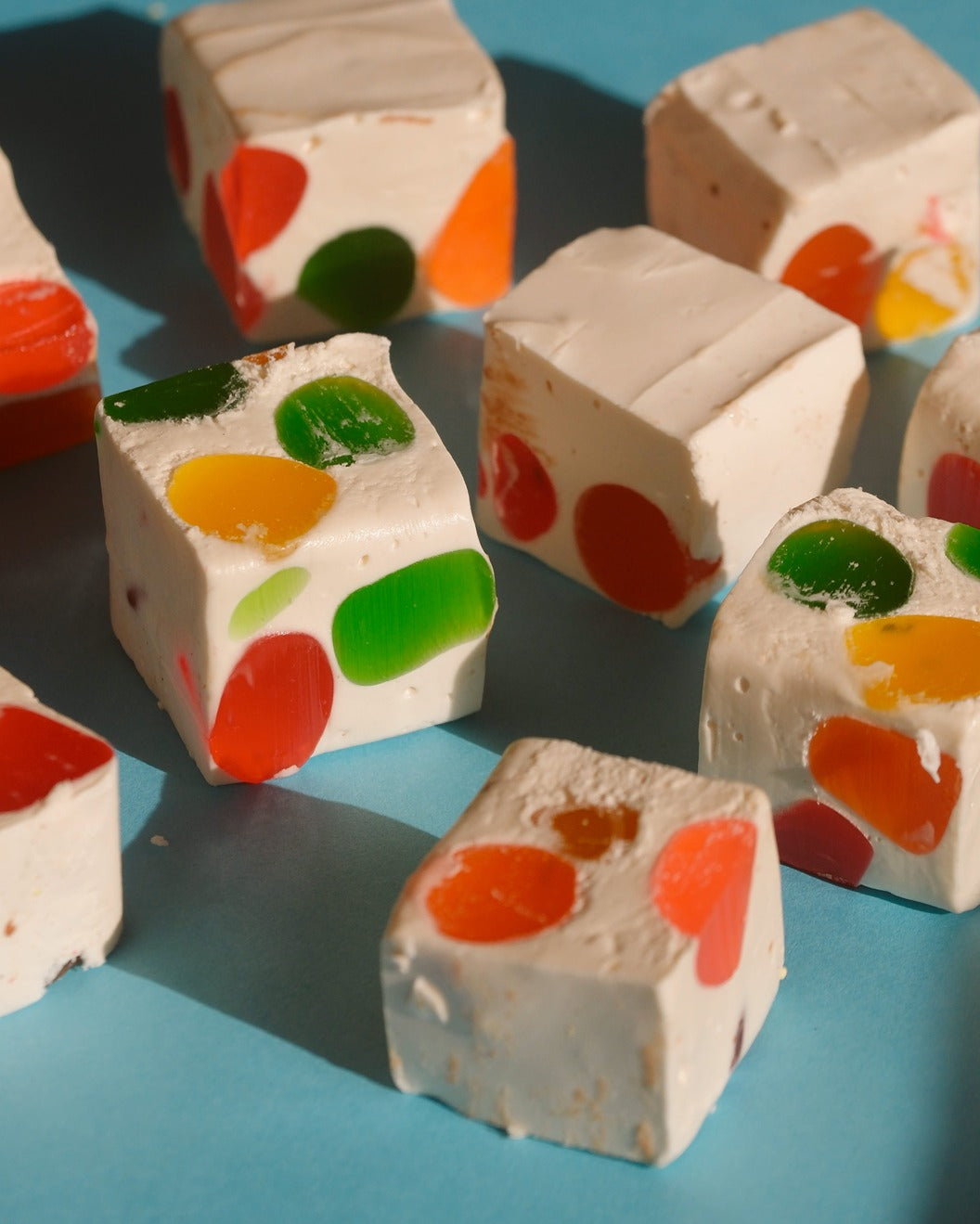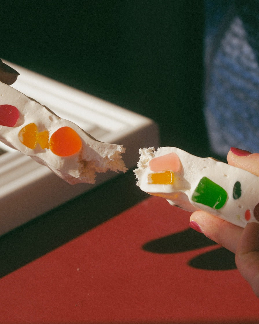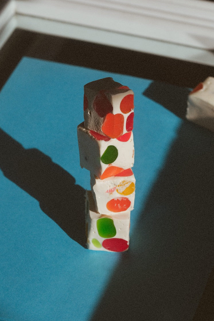 A true "penny candy" classic that tastes like childhood. Soft, pillowy nougat loaded with colorful, fruity DOTS candies. Our Confetti Nougat is hand-cut and sold in ~3 oz. portions.